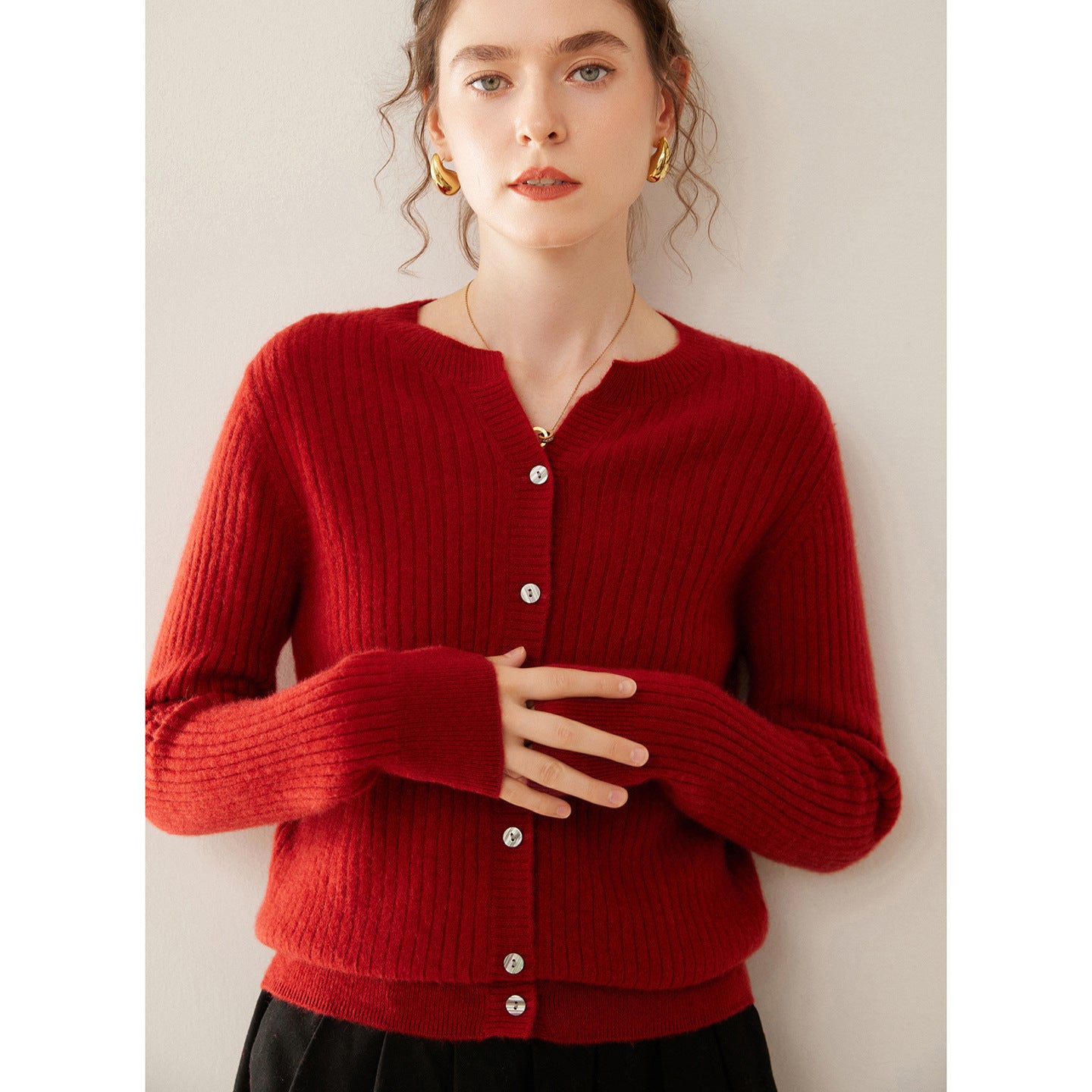 This pure cashmere cardigan is crafted from 100% premium cashmere, offering natural warmth and exceptional softness. The half–open collar and clean, vertical–rib structure create a refined silhouette that is comfortable yet visually lengthening.