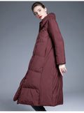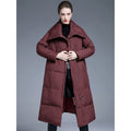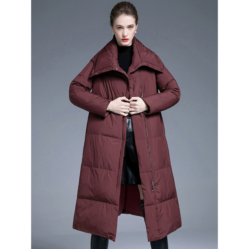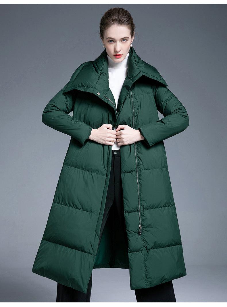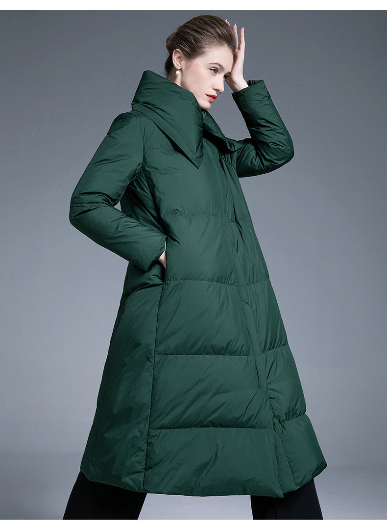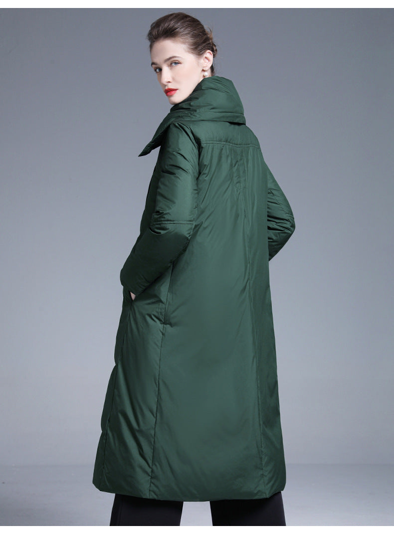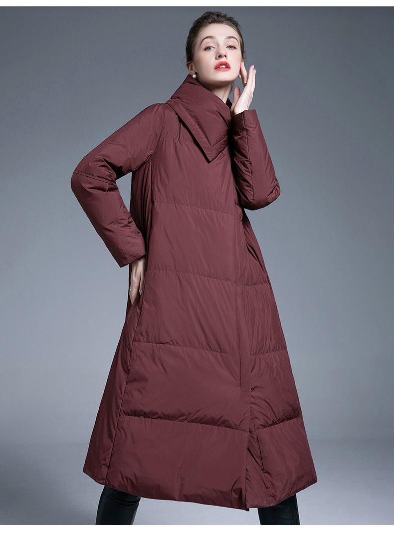 This long over-the-knee down coat is designed with a wide, relaxed silhouette that provides excellent warmth while maintaining a refined appearance. Filled with 90% white duck down, it offers dependable insulation without unnecessary bulk, making it comfortable for long daily wear.