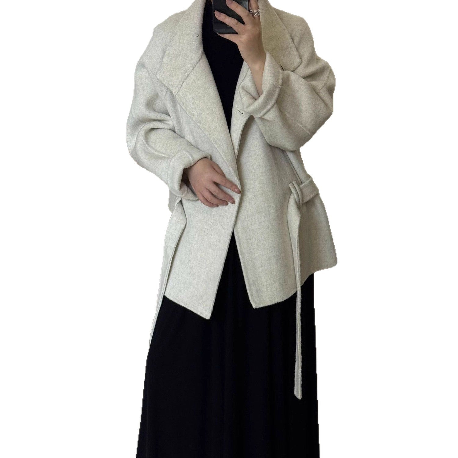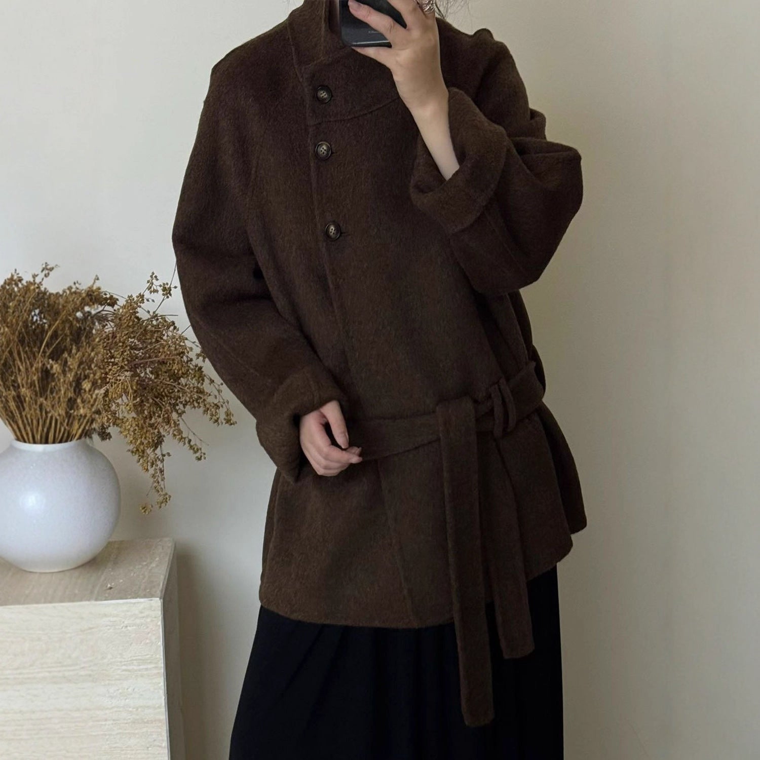 Women’s Double-Sided Wool Coat – Mid-Length Elegant Tie Waist Jacket, High-End Stand Collar Outerwear