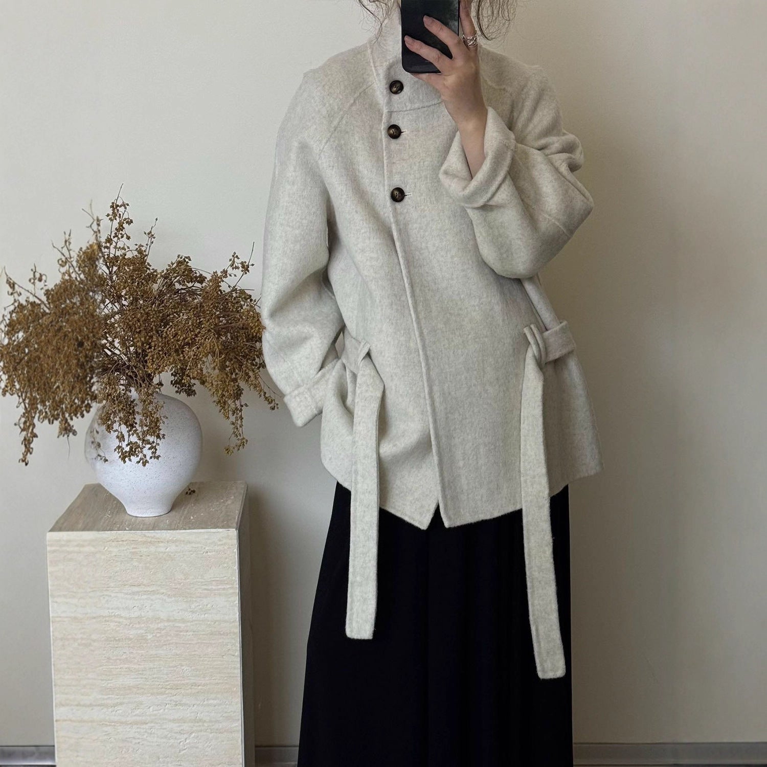 The structured stand collar adds a modern, refined touch while helping keep warmth around the neck. Double-sided wool finishing ensures a polished, high-end appearance.