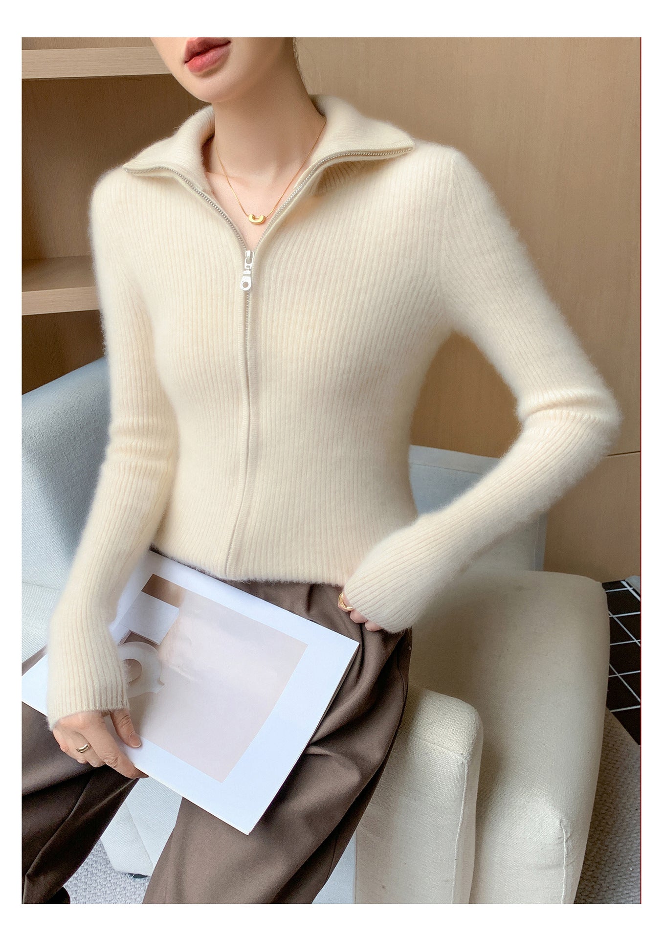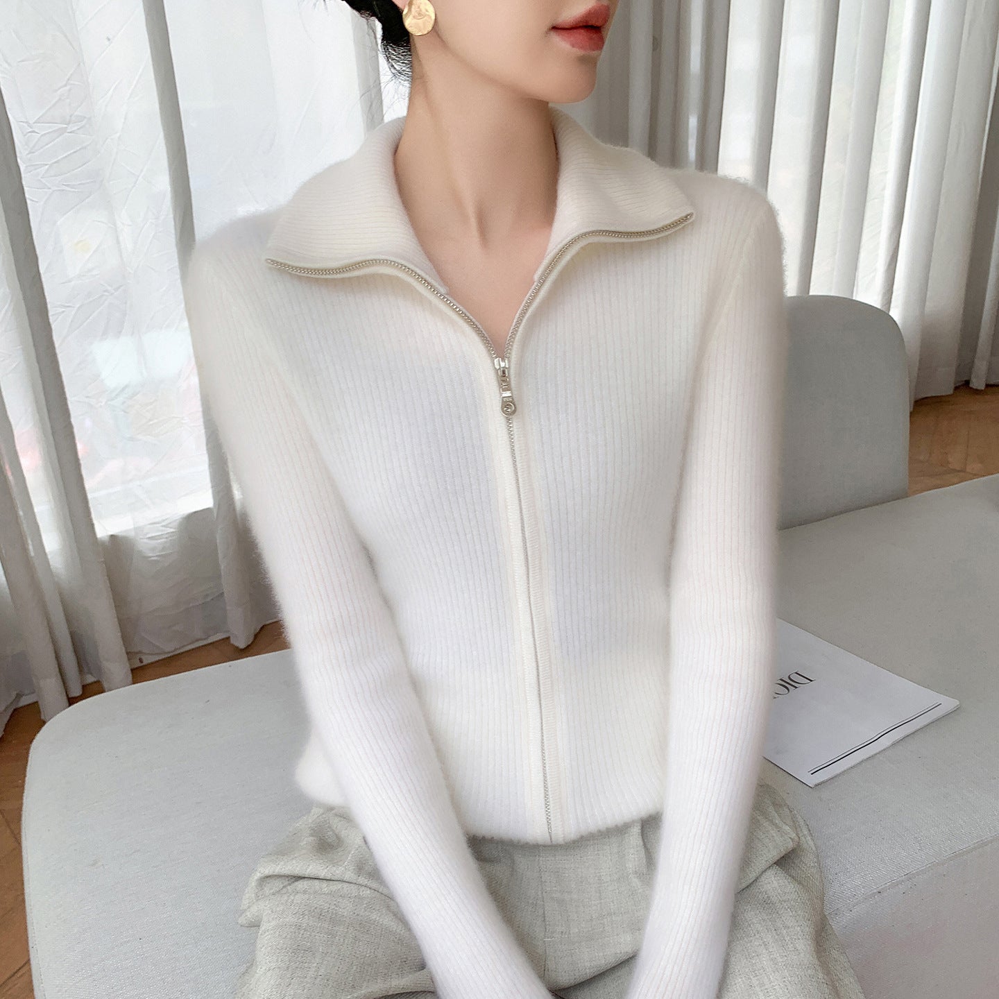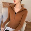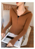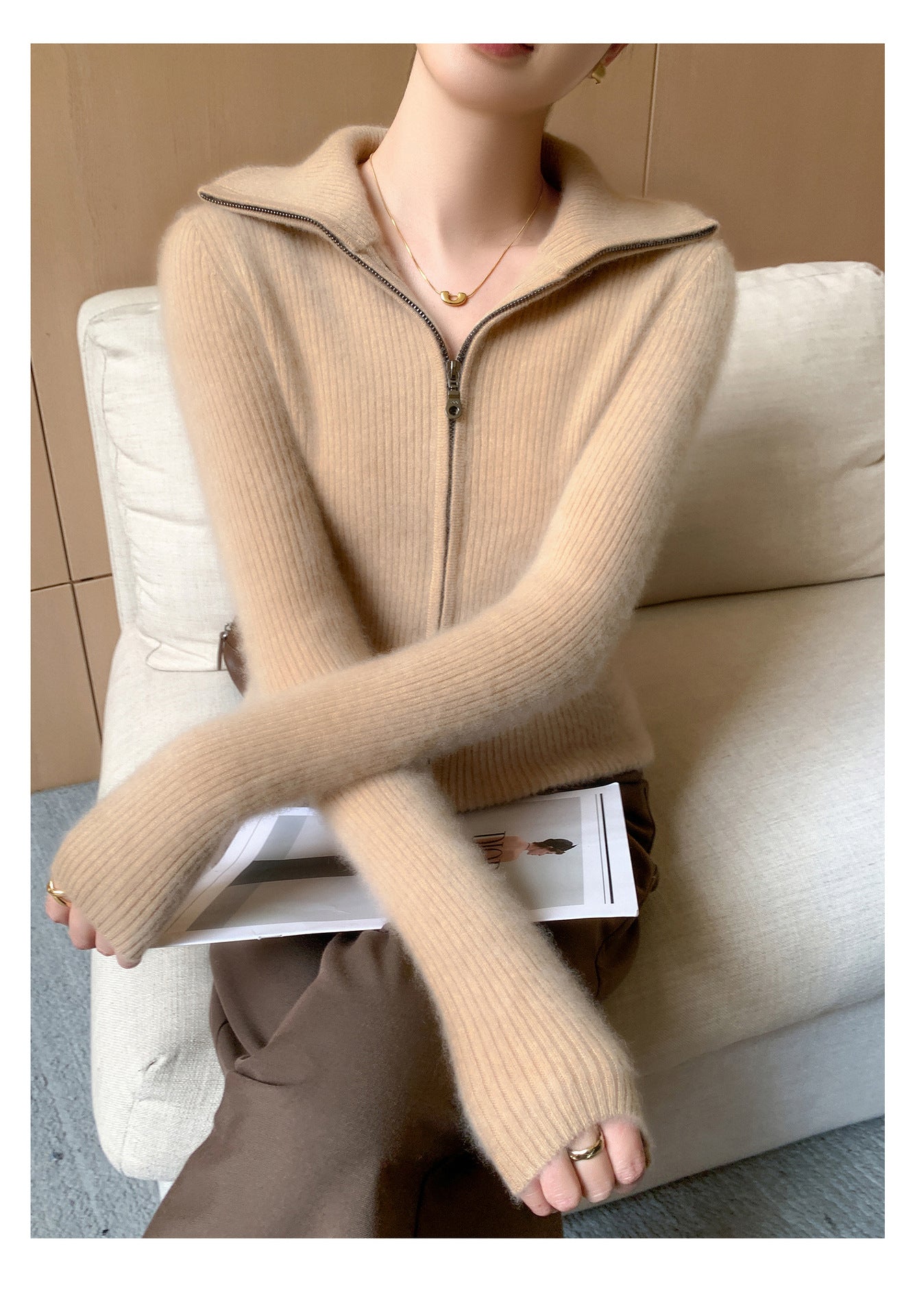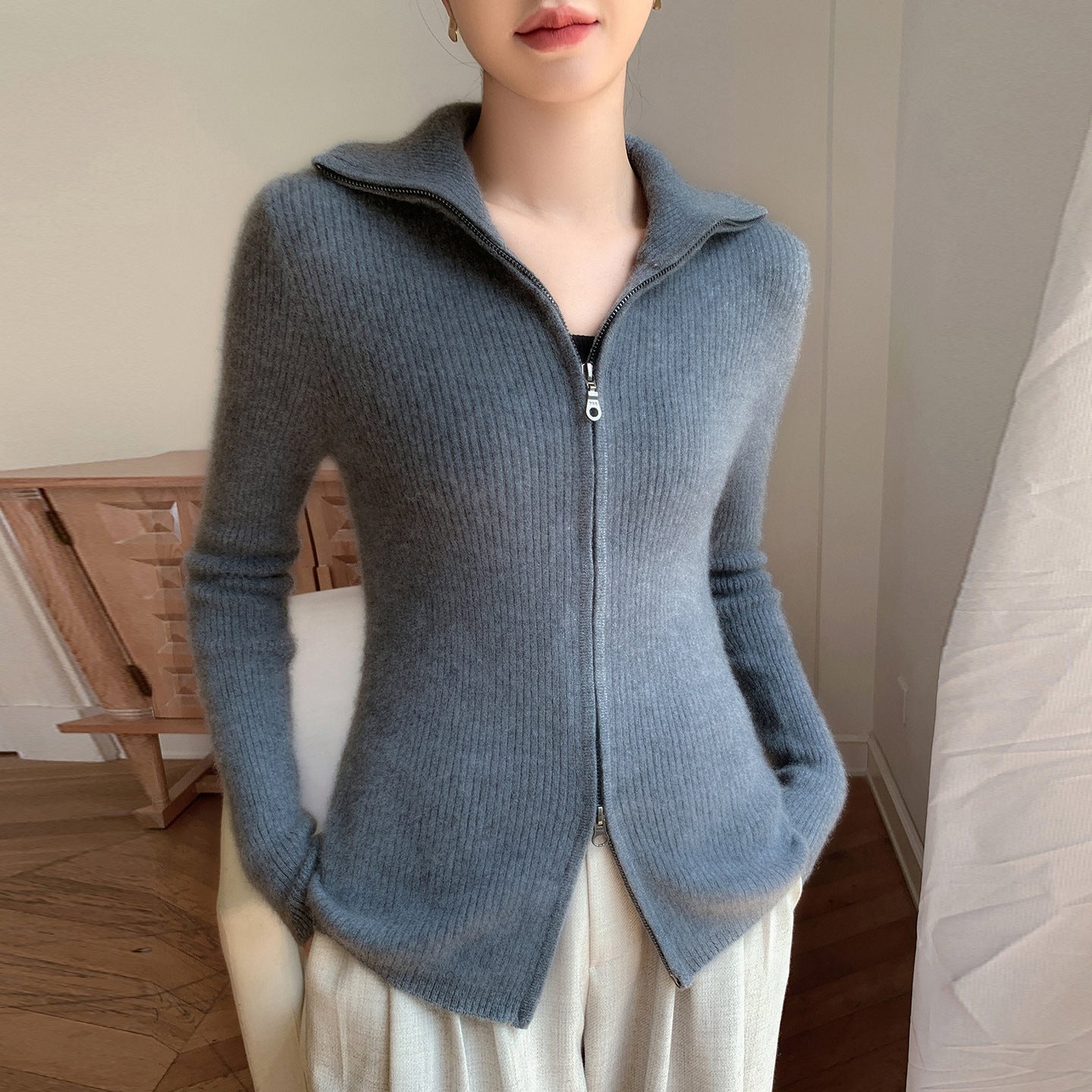 The double zipper allows you to adjust the fit for maximum comfort and versatility, while the turn-down collar adds a stylish, sophisticated touch. Whether you’re wearing it over a blouse for work or layering it on a chilly day, this cardigan complements any outfit effortlessly.