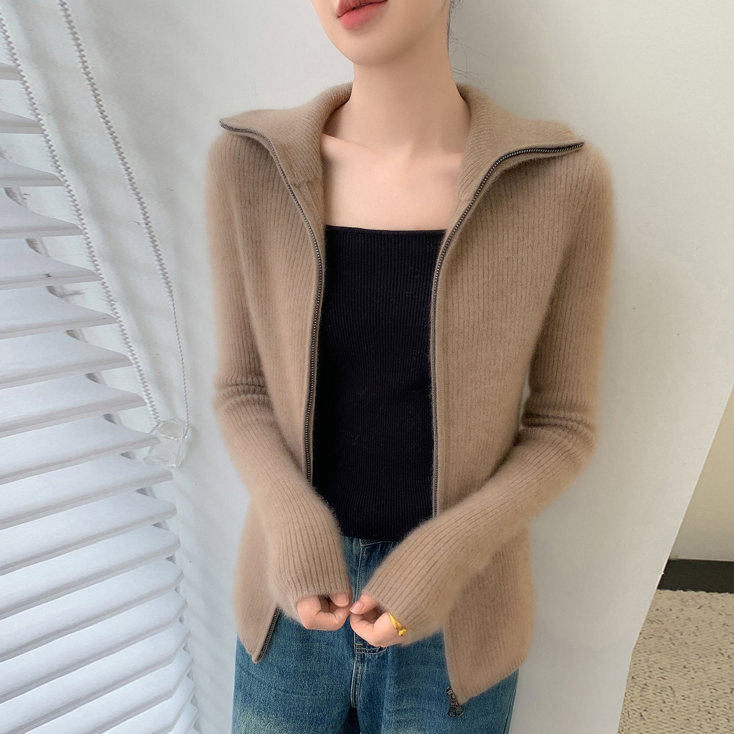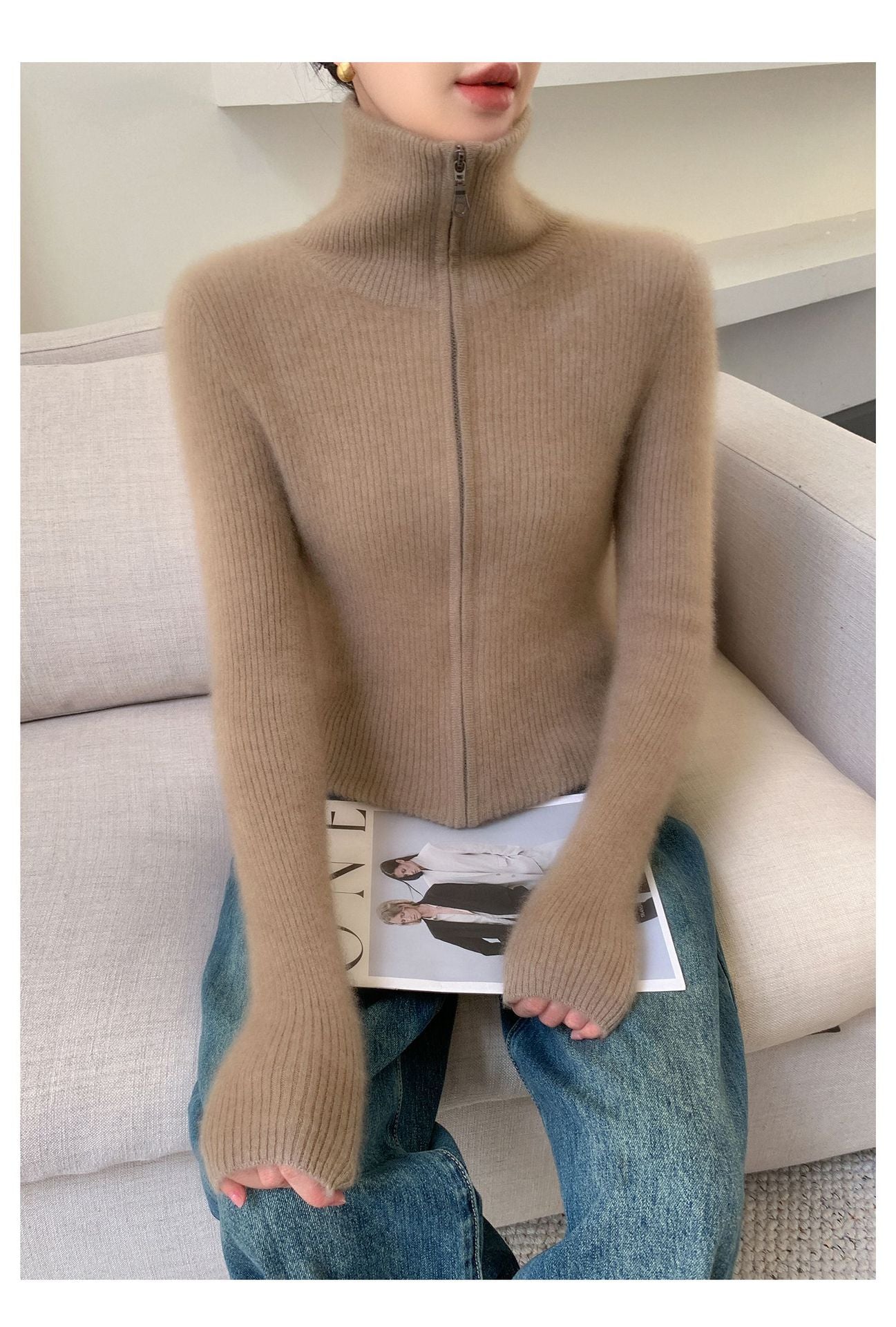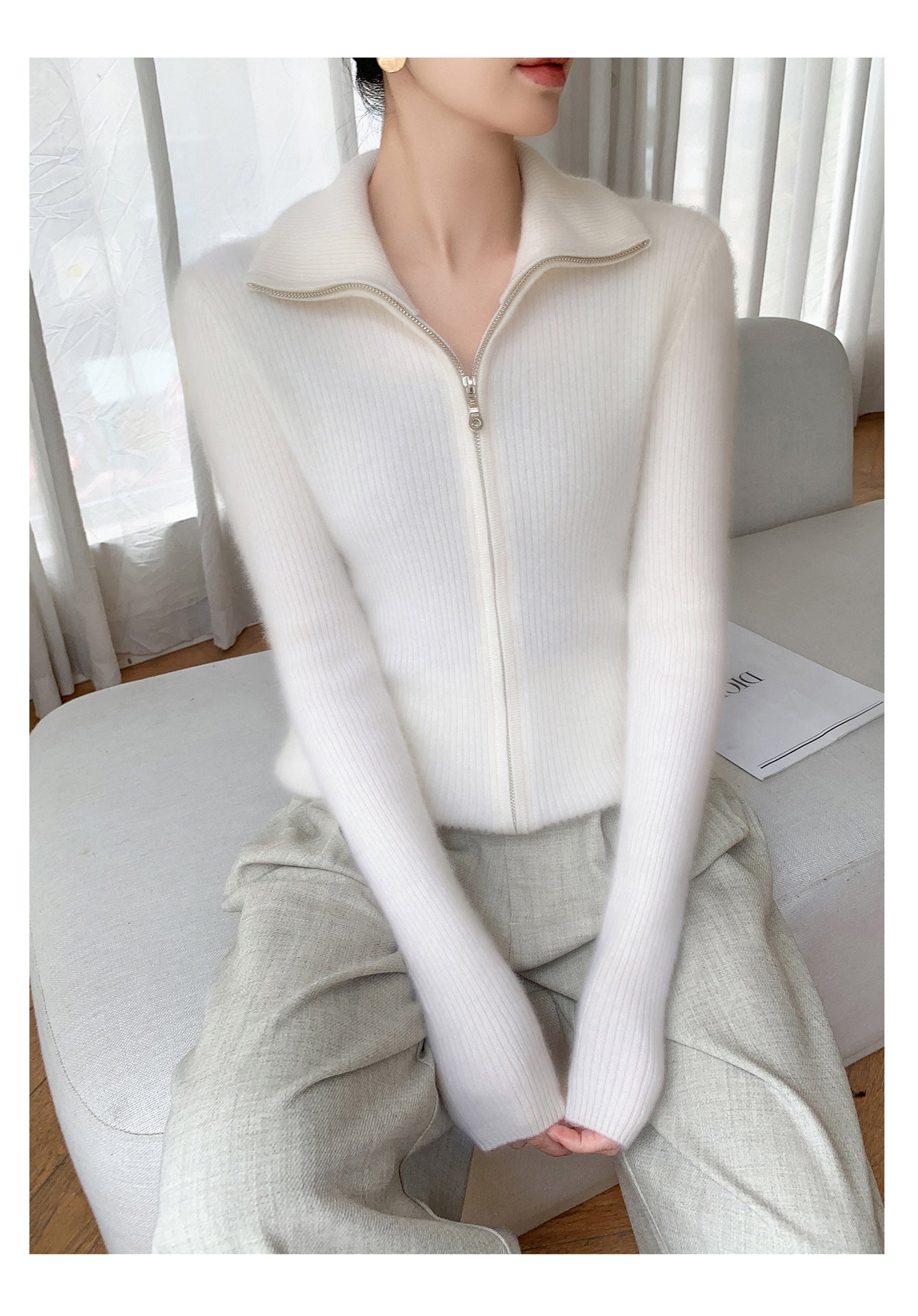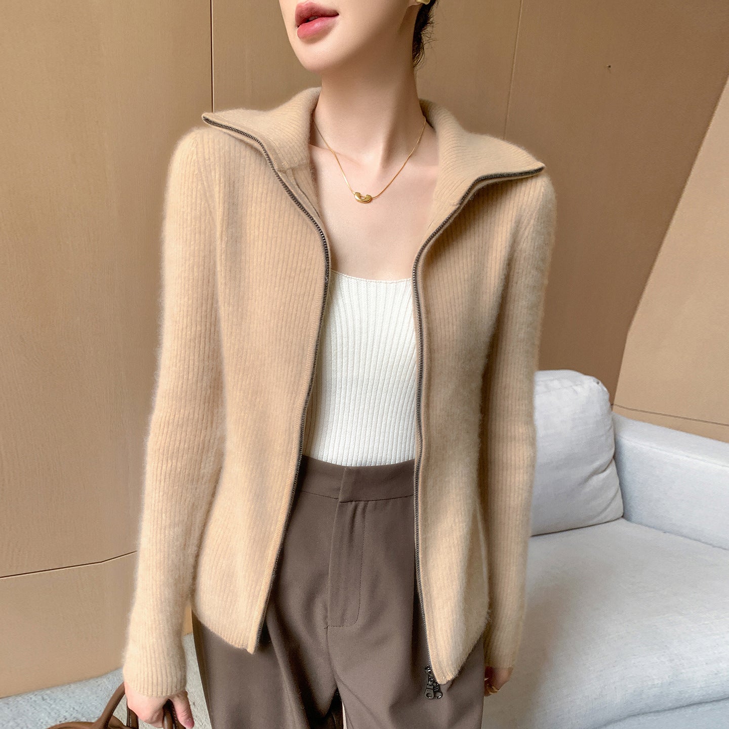 The double zipper allows you to adjust the fit for maximum comfort and versatility, while the turn-down collar adds a stylish, sophisticated touch. Whether you’re wearing it over a blouse for work or layering it on a chilly day, this cardigan complements any outfit effortlessly.