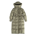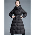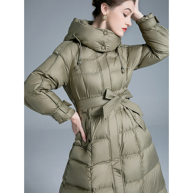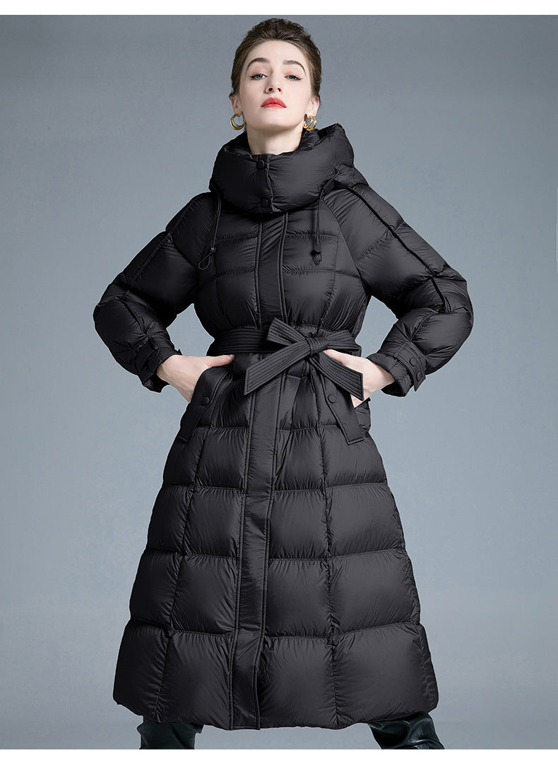 Filled with premium 90% white duck down, it creates a cloud-like thermal barrier that makes icy winds feel like a gentle breeze. The luxurious long silhouette drapes beautifully over your figure, while the adjustable lace-up design adds a stylish European-edge aesthetic. The detachable hood gives you the freedom to switch between casual chic and minimalist sophistication.