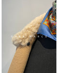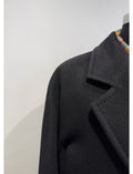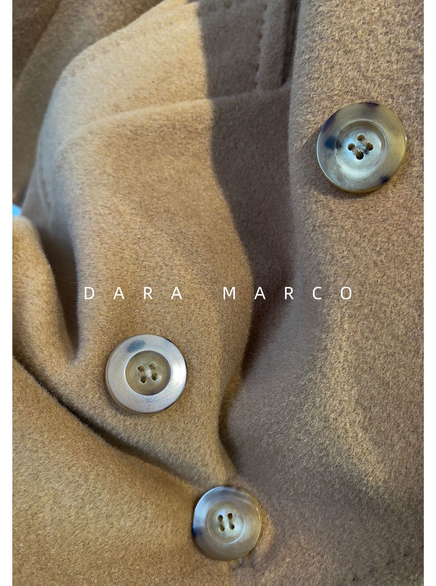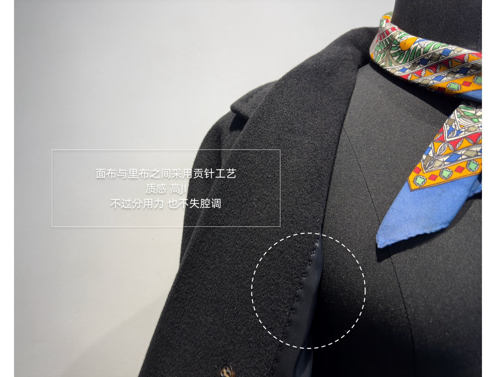 The double-breasted cocoon shape creates a graceful outline that flatters the shoulders, slims the waist visually, and adds effortless confidence to any outfit. -