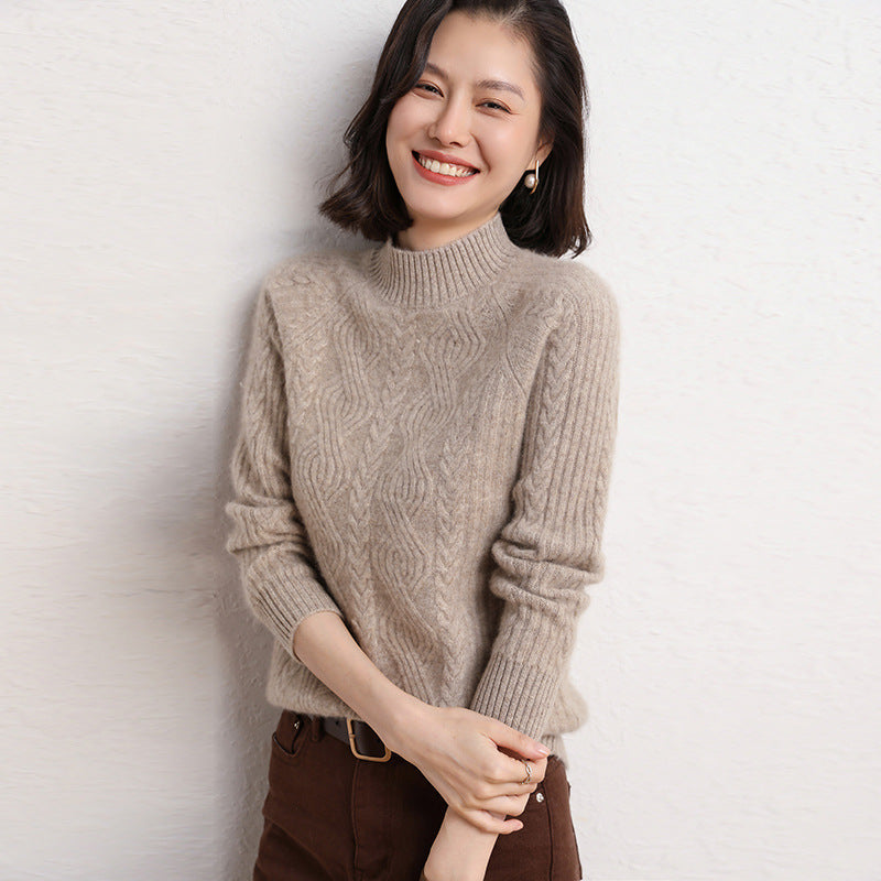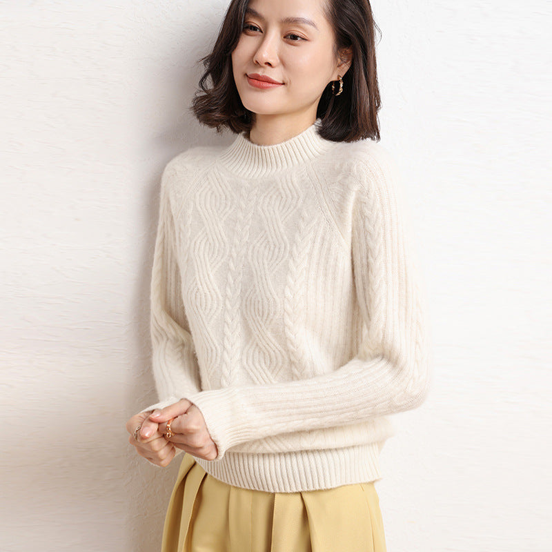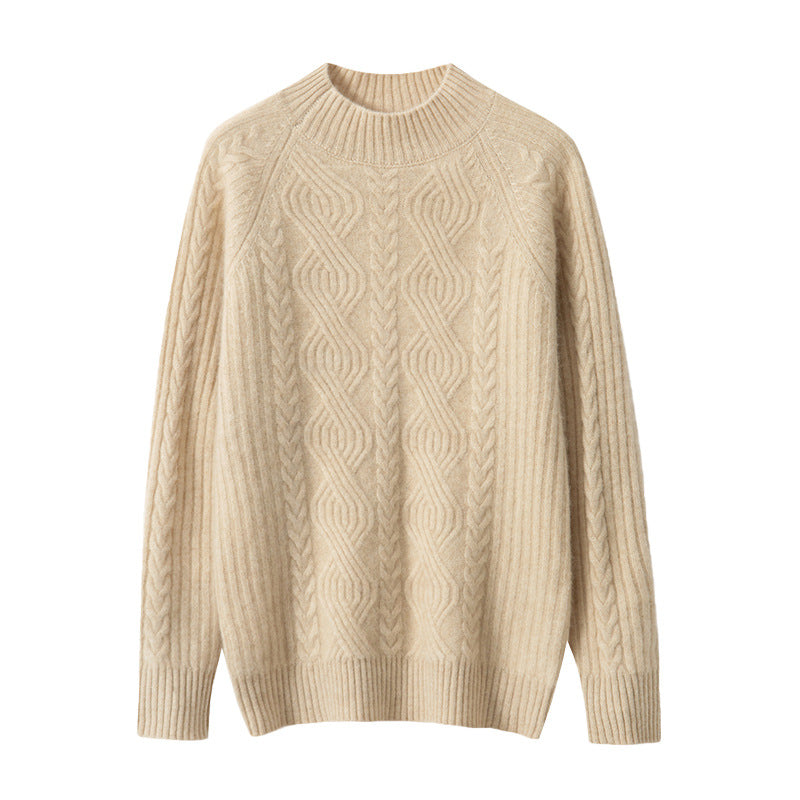 This half-turtleneck cashmere sweater is crafted from 100% pure cashmere, offering natural softness, reliable warmth, and a breathable feel suitable for daily wear. The double-rib knit structure adds thickness and stability, allowing the sweater to drape smoothly while remaining comfortable for extended use.