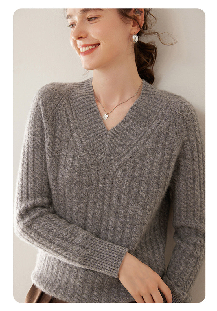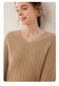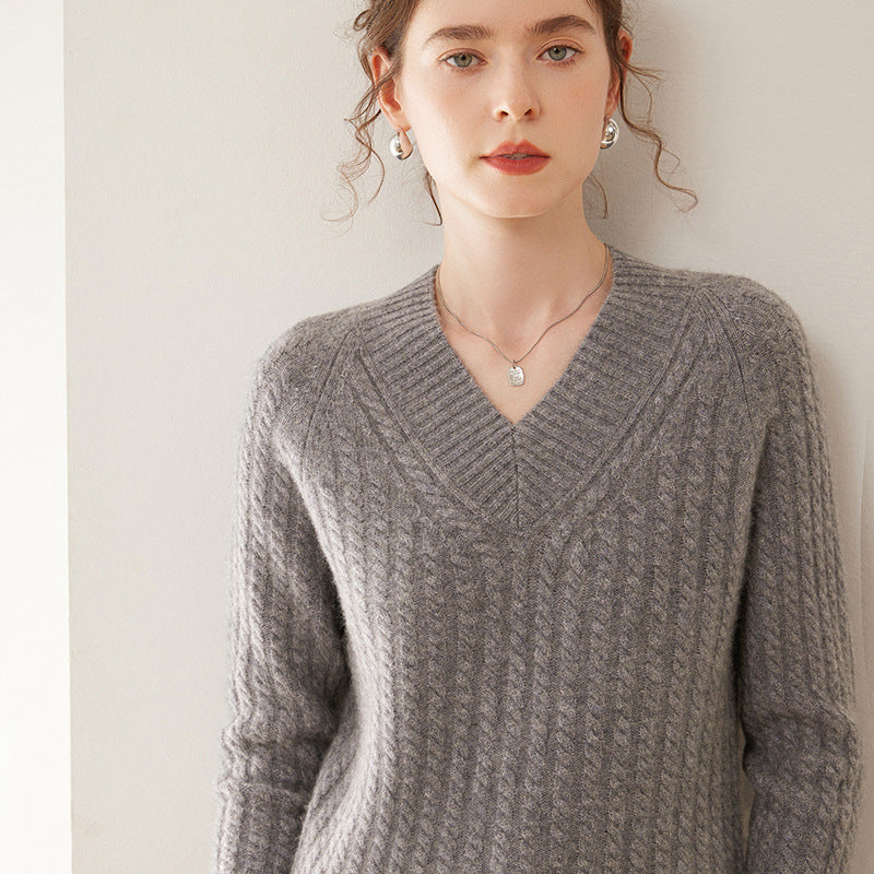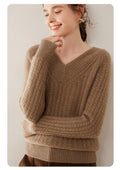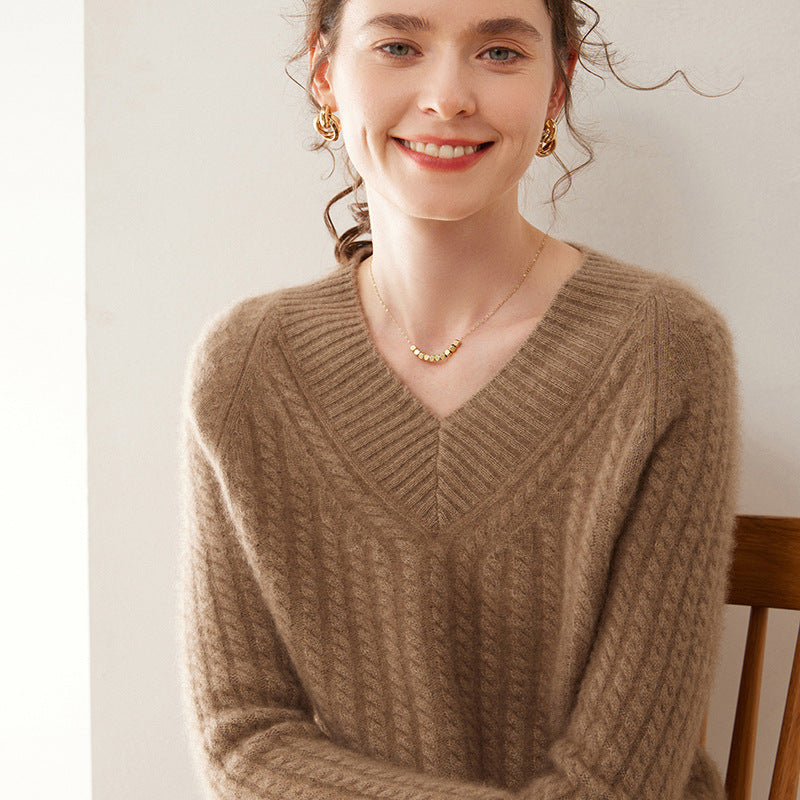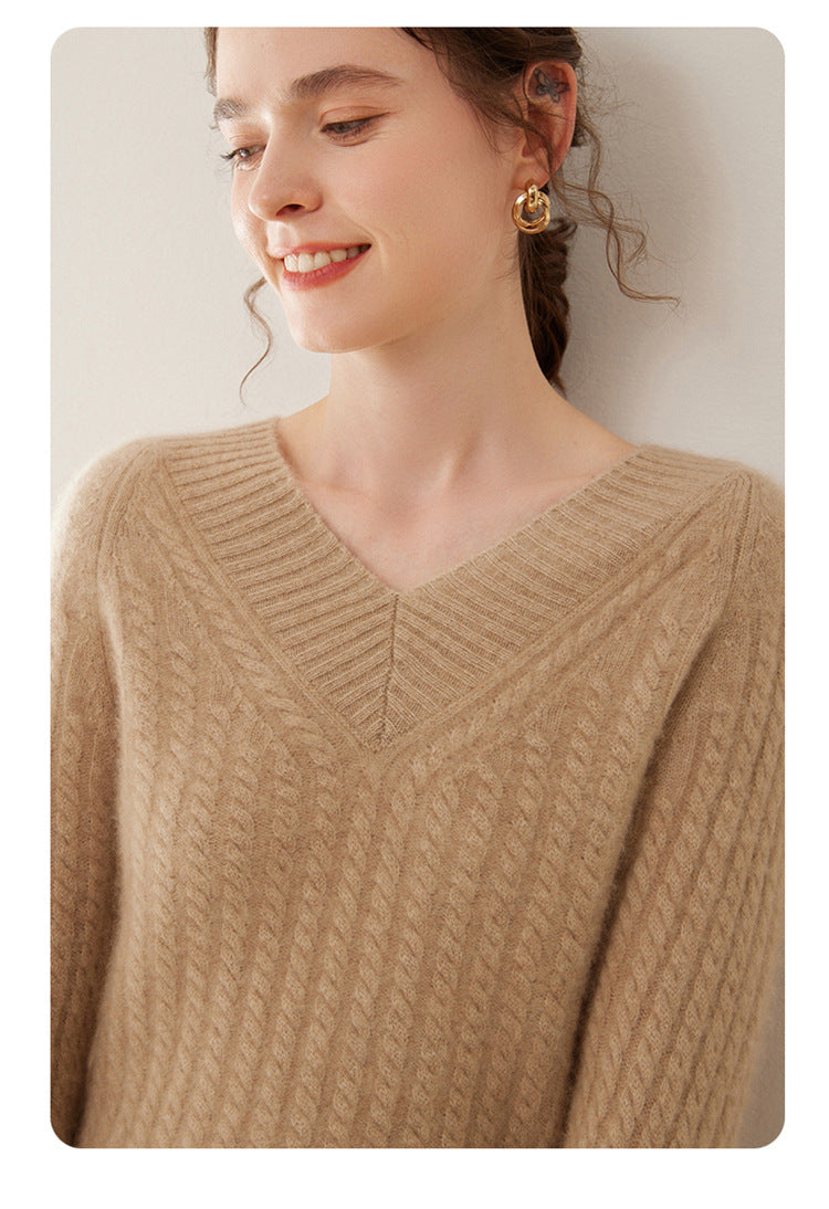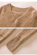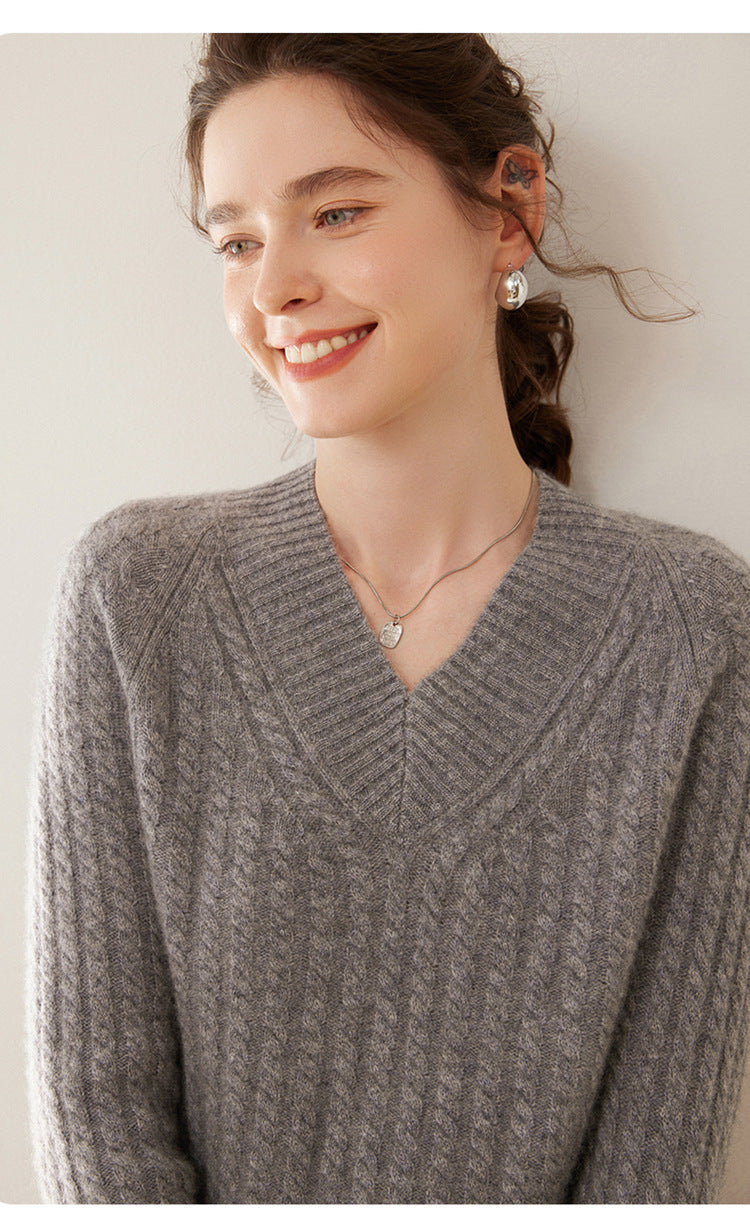 Cashmere V-Neck Sweater for Women – Thickened Cable Knit Loose Base Layer