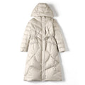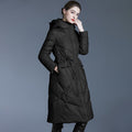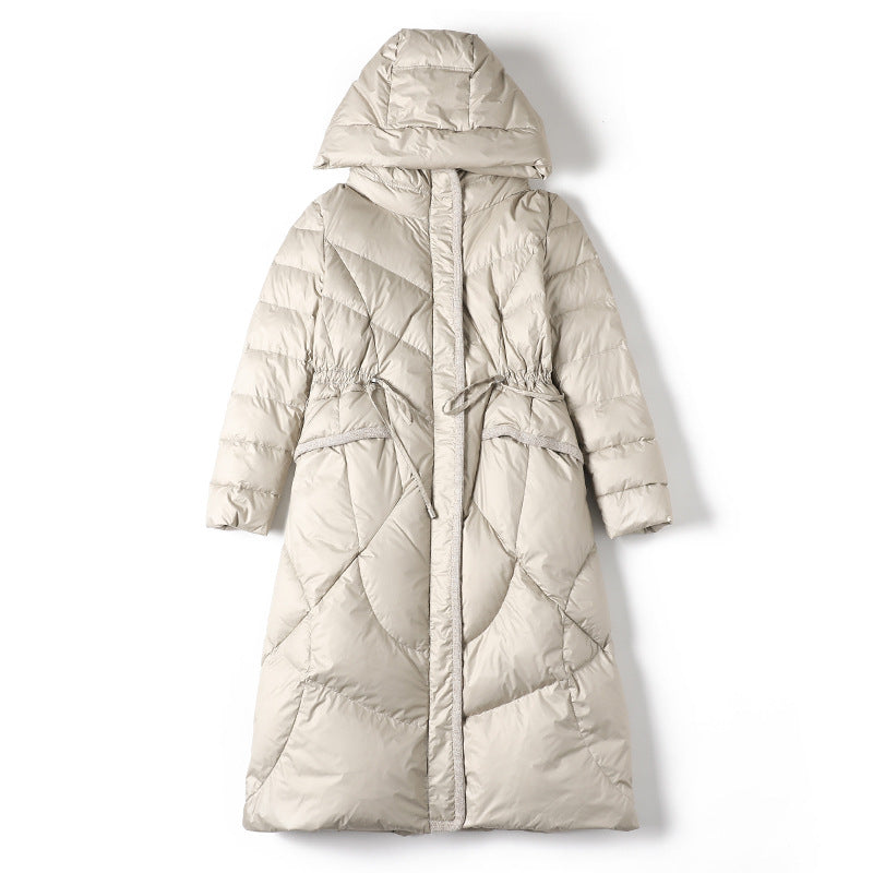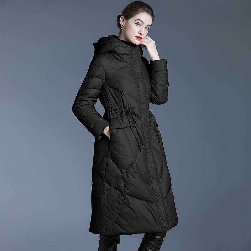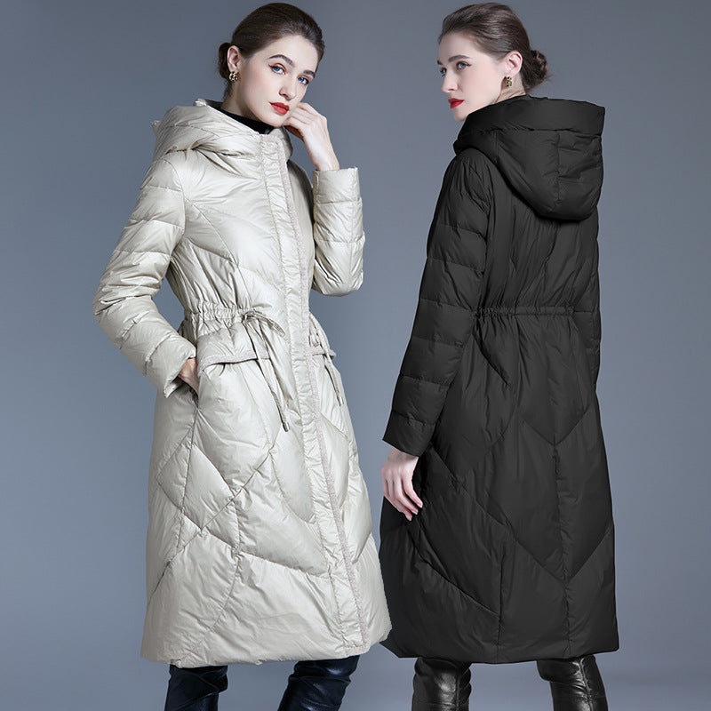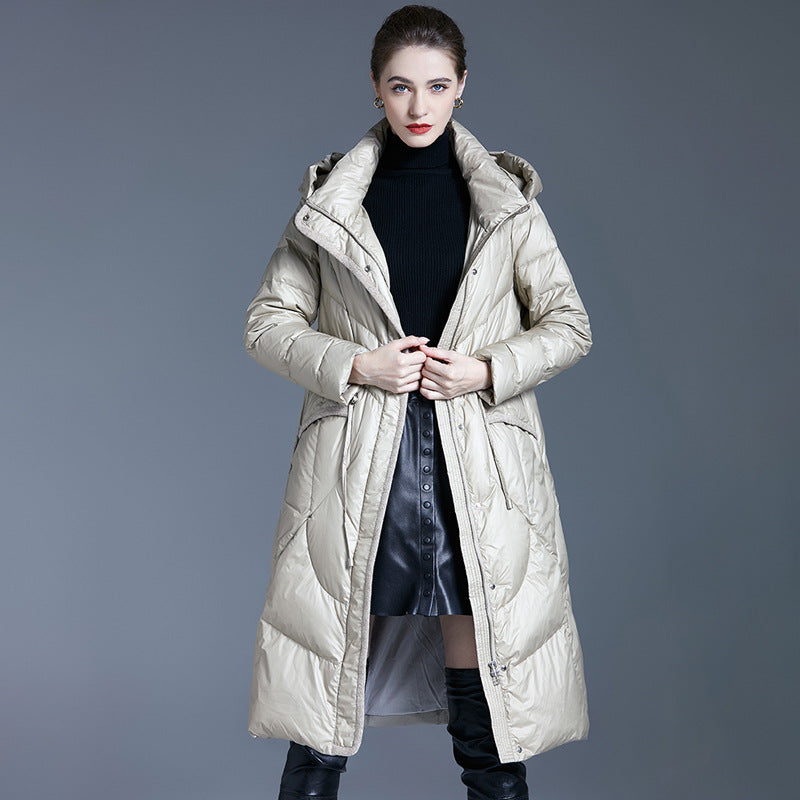 This mid-length hooded down coat is filled with 90% high-quality white duck down, offering reliable warmth and excellent insulation for cold winter weather. The thickened construction provides substantial protection without feeling overly heavy, making it suitable for everyday commuting and outdoor use.