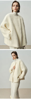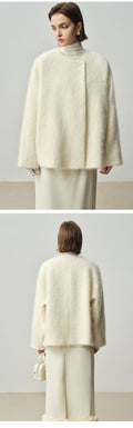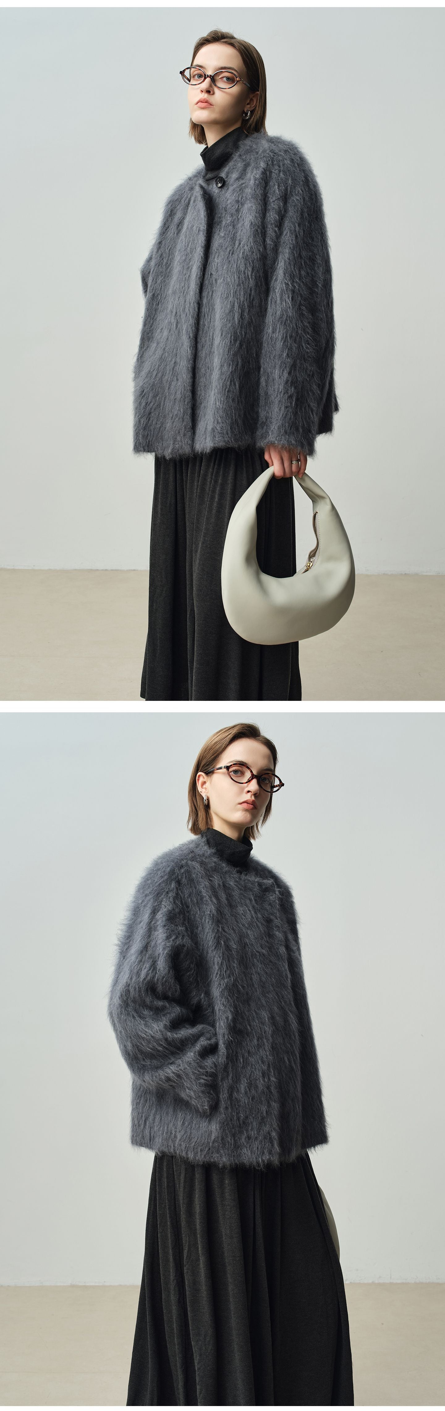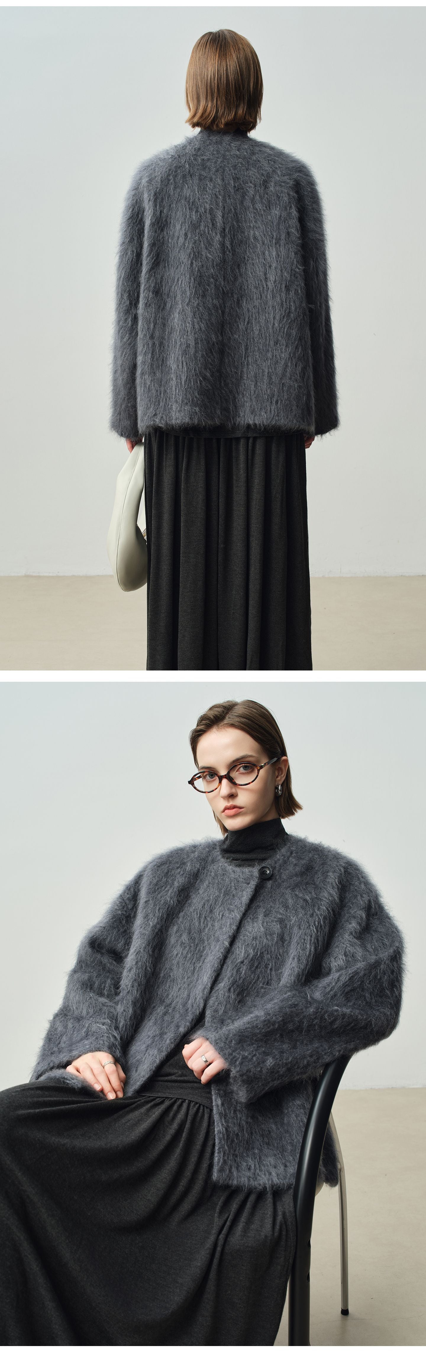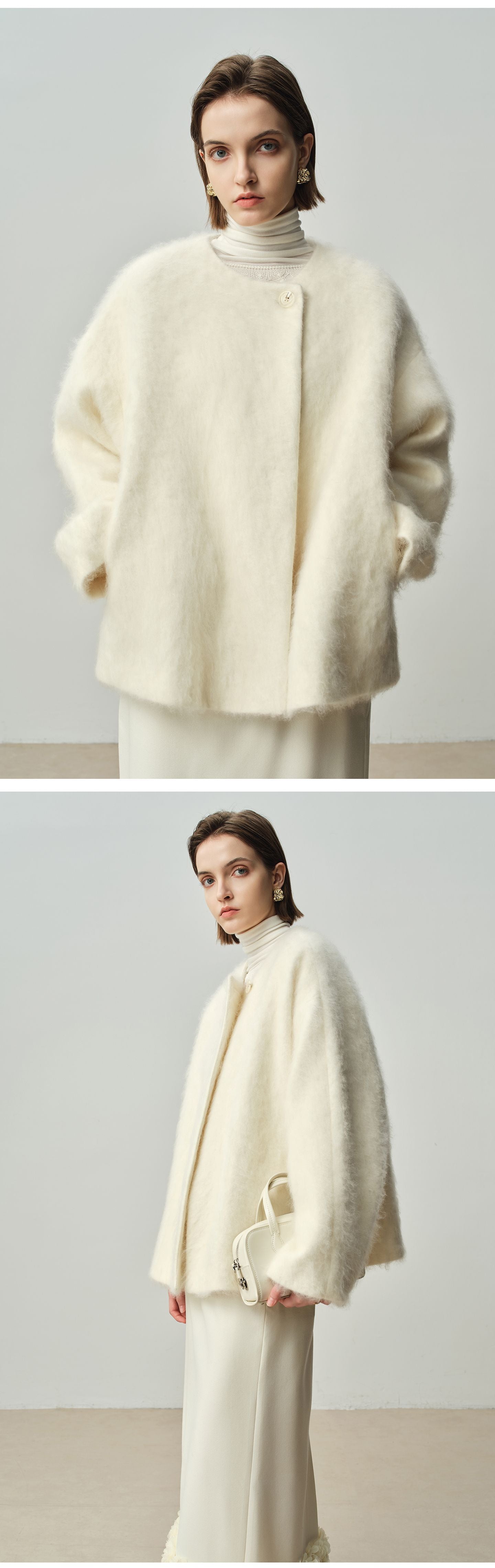 The minimalist single-button closure adds a touch of sophistication to this coat, making it a versatile piece that can be dressed up or down. The round neck ensures an elegant silhouette, flattering various body types.