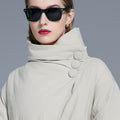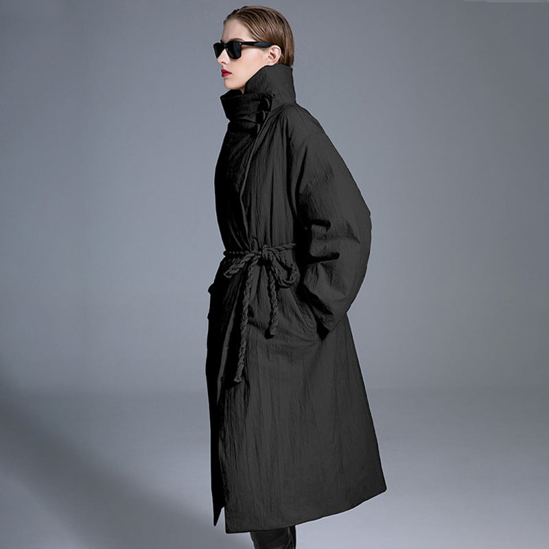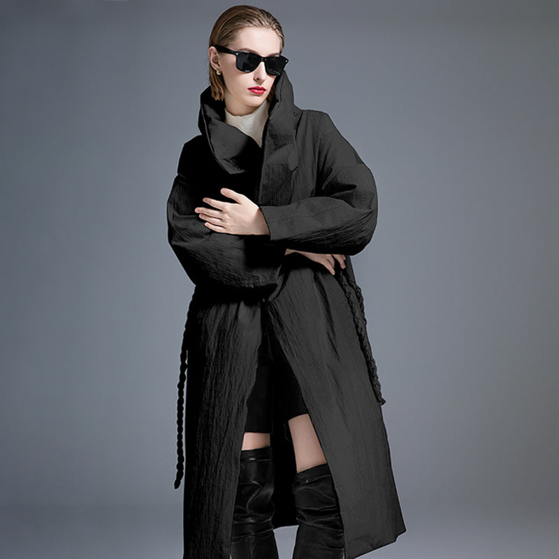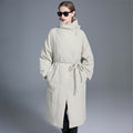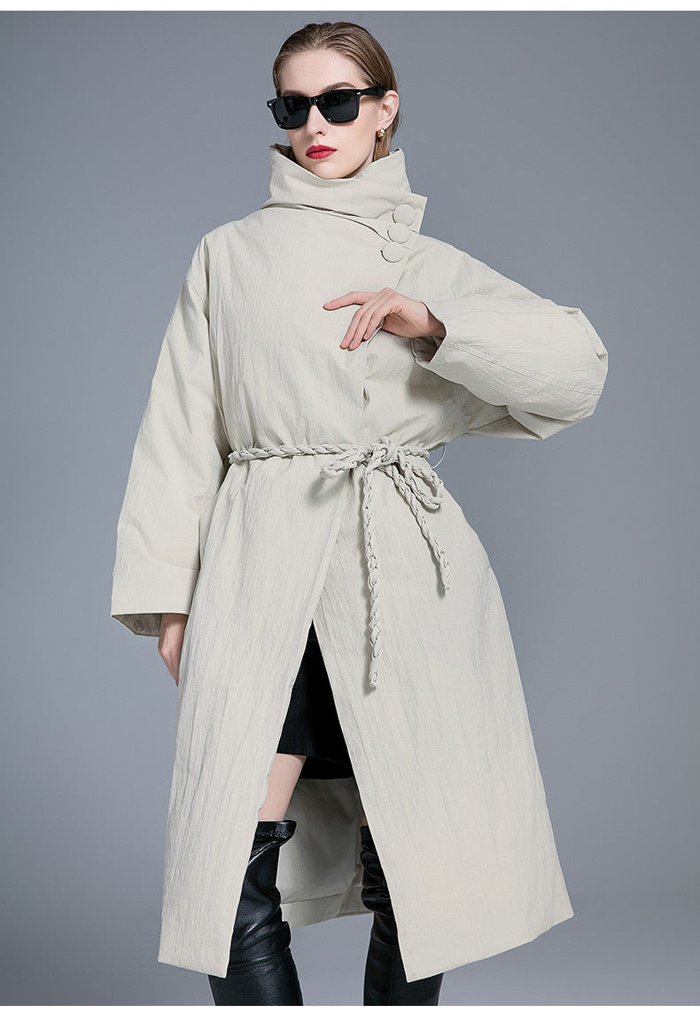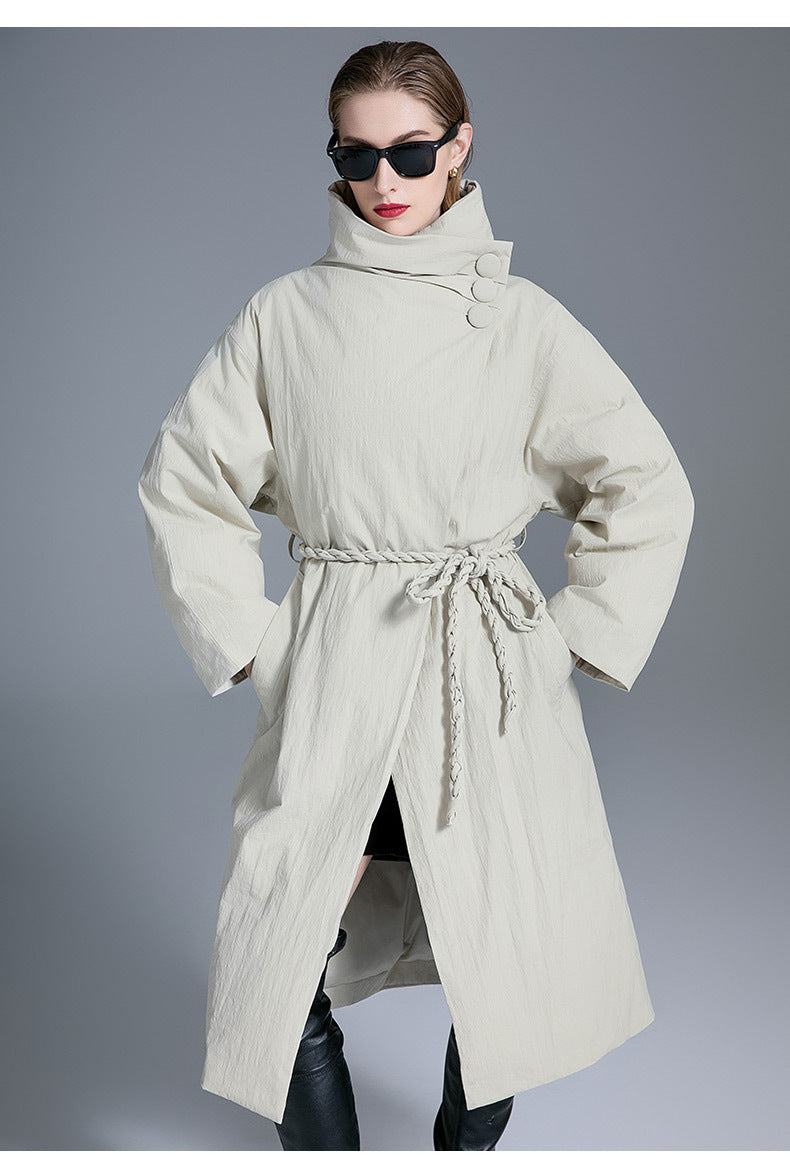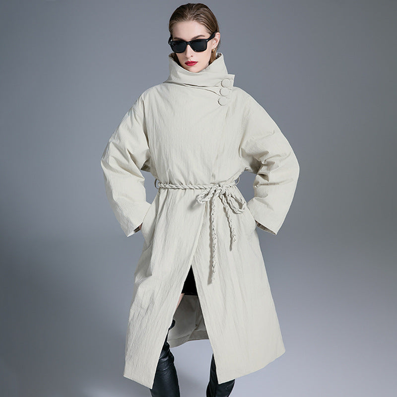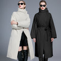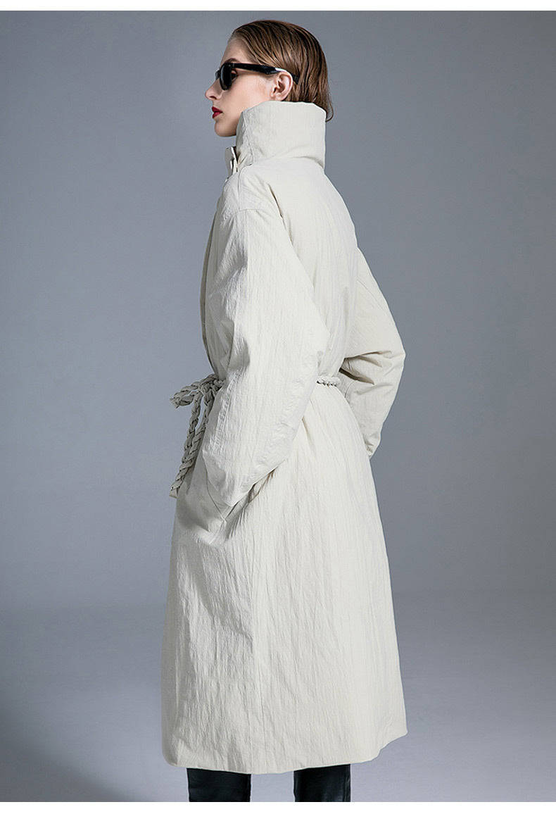 This long white duck down coat features a loose, comfortable silhouette with a pleated twist belt design that adds structure while maintaining an effortless look. Filled with 90% white duck down, it provides reliable warmth and insulation for cold winter days, while the high-density outer fabric enhances durability and wind resistance.
