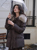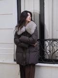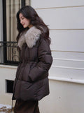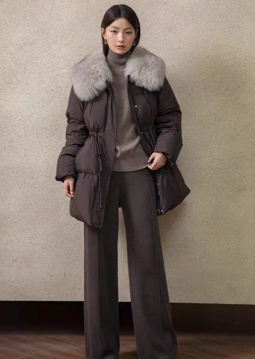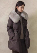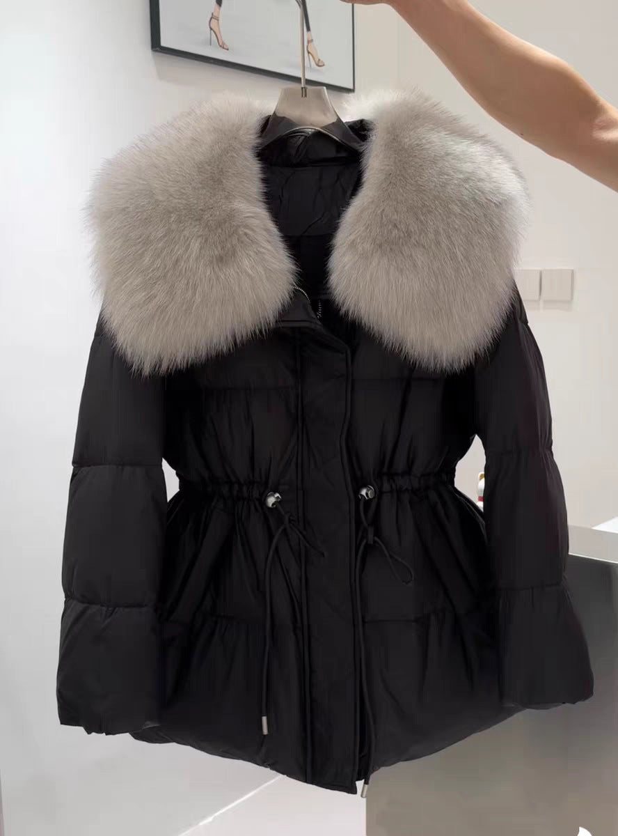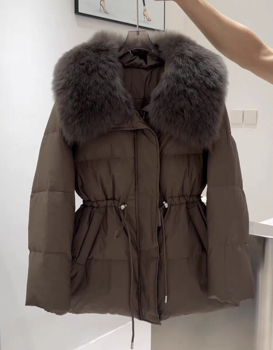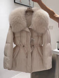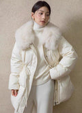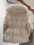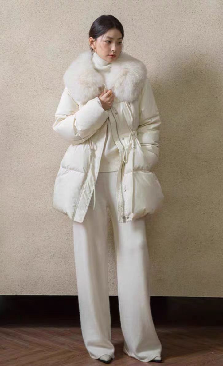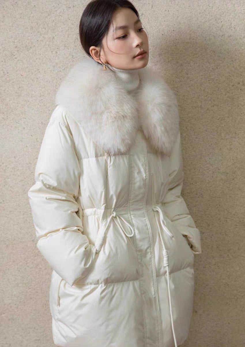 High-End Fox Fur Collar, Waist-Cinching, Mid-Length, White Duck Down